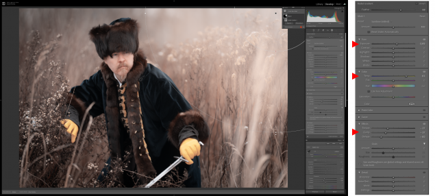 Špičkové objektívy sú niekedy až príliš ostré a pri portrétoch preto zámerne znižujem textúry a zreteľnosť, difúzuje sa tým svetlo, pritom fotografie ostávajú ostré. Celkovú svetelnú atmosféru naviac dotváram lokálnymi úpravami. Zosvetľujem a stmavujem časti obrazu, aby som dosiahol kontrastnejšie nasvietenie. Prípadne ešte lokálne znížim zreteľnosť a texúry, alebo vytvorím „falošné“ svetlo