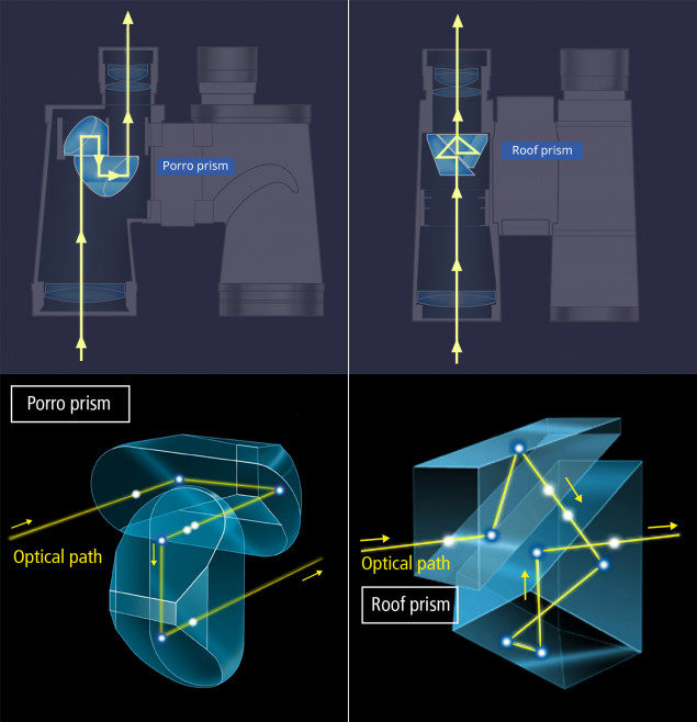 Kým ROOF dizajn objektívov ďalekohľadu je rovný, u porroprizmatických sú objektívy akoby zalomené. Každý dizajn má svoje výhody. Pôvodný dizajn prvých ďalekohľadov bol porroprizmatický. Je jednoduchší na optický výpočet aj na zhotovenie. Priamy strechový typ ďalekohľadu je kompaktnejší a v prípade nových špičkových technológií dokáže kvalitou obrazu (rozlíšenie, kontrast) prekonať klasickejší porroprizmatický dizajn.