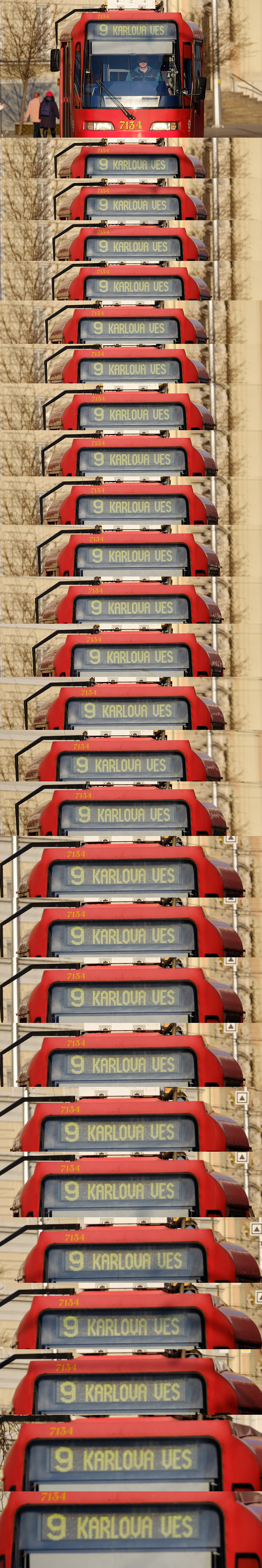V režime single objektív reaguje bezchybne a priam perfektne. Situácia sa mení, ak by ste objektívom chceli sledovať rýchlejšie sa pohybujúci alebo nepredvídateľne sa pohybujúci objekt v režime C - Continuous. Keď v režime Single objektív prekonal zrkadlovkové profi zoomy, tu musíme priznať jeho slabšiu stránku. Nie, zatiaľ mirrorless systém stále nedosiahol schopnosti profi zrkadloviek v sledovaní rýchlo či nepredvídateľne pohybujúcich sa objektov. Neznamená to, že pri kontinuálnom preostrovaní nemožno vyfotiť ostrý záber, ale percento úspešnosti je pomerne nízke. Ak ste napríklad zvyknutí s profi zrkadlovkou dosiahnuť 80% úspešnosť, v prípade X-T1 + XF 50-140 je to možno polovica. Pri kontinuálnom snímaní sa aj častejšie stáva, že objektív zapumpuje a preženie ostriaci mechanizmus z jedného konca na druhý, čím fotograf stratí dôležité sekundy. Na nasledujúcej ukážke získate predstavu o kontinuálnom preostrovaní. Na začiatku si AF vodil veľmi dobre, no ako sa električka priblížila a a relatívna zmena vzdialenosti bola väčšia, AF-C už začal zaostávať.