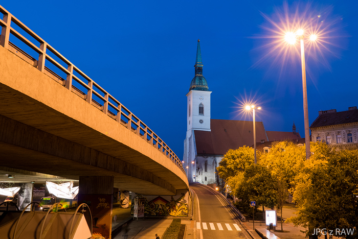 Nočné fotografovanie je zábavné. Fotoaparát pekne zachytí svetlá aj zvyškové svetlo z oblohy, kým je ako tak intenzívne. Objektív zvláda bodové protisvetlo na dobrej úrovni. Sem tam sa objavia odlesky, ktoré majú tvar "cibule" ale nie extrémne veľa a extrémne rušivo. Odlesky dostanú ostrejší tvar pri priclonení objektívu. Pri priclonení taktiež svetlá vytvárajú výraznejšie hviezdice. Objektív je ale natoľko dobrý odclonený, že už od clony F8 sa prejavuje jeho zmäkčenie v dôsledku difrakcie. Osvedčilo sa mi nastavenie clony na F5,6 - 8.