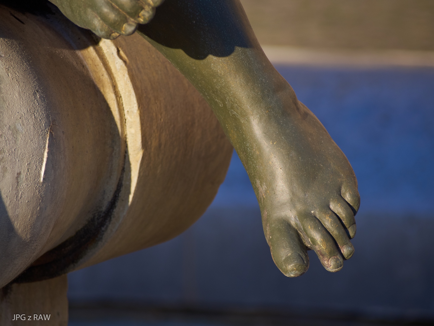 Na 100% výreze fotografie vidíte, ako JPG algoritmus odstránil jemné detaily v štruktúre sôch. Vo obraze vyvolanom z ORF formátu je síce viac šumu, ale aj omnoho viac detailov. Šum v tomto prípade absolútne nevadí, keďže jeho odstránenie urobí viac škody ako osohu. Pozor, tento rozdiel v detailoch neuvidíte, kým fotografiu nevytlačíte aspoň na formát A4 a väčší. Čiže ak fotografujete iba na web alebo do malého albumu, nemusíte sa tým vôbec zaoberať. Ak by ste však chceli vystavovať veľmi veľké fotografie, RAW (ORF) je cesta.