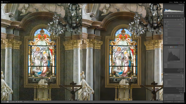 ISO 12800 pred a po použití AI odšumovacej funkcie Denoise.