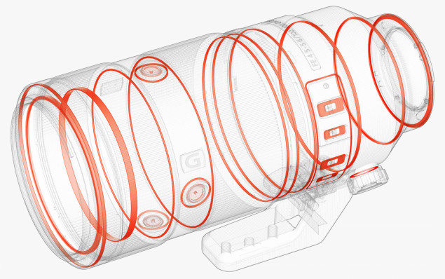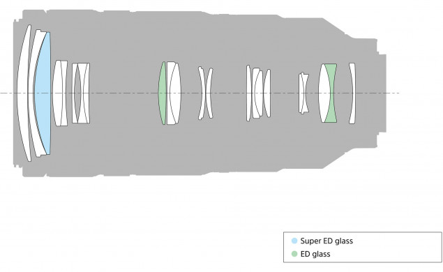 Na boku je štvorica prepínačov: AF/MF, limiter zaostrovacej vzdialenosti, prepínač stabilizácie obrazu a prepínač režimu stabilizácie obrazu. Súčasťou objektívu je statívový prstenec s odnímateľnou päticou. Veľká slnečná clona je vo vnútri pokrytá sametovým náterom. Je v nej okienko pre ľahšie ovládanie polarizačného filtra. Priemer filtrovej obruby je 77 mm.