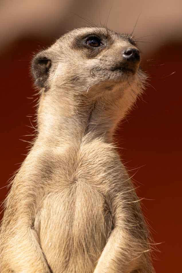 Aj u zvierat zaostrujeme na oči. Hoci je za surikatou betónový múr, vďaka malej hĺbke ostrosti nepôsobí rušivo.
