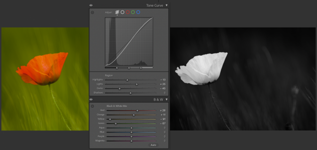Riadený prevod farieb na odtiene šedej v programe Adobe Lightroom. Plus zvýraznenie kontrastu pomocou gradačnej krivky.