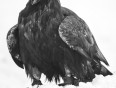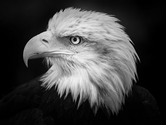 Biela hlava orliaka na tmavom pozadí.