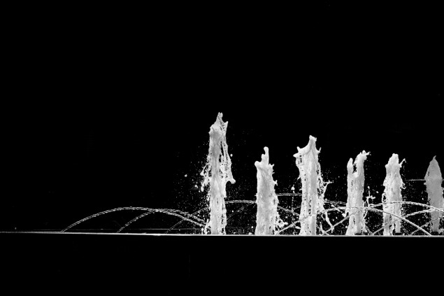 Protisvetlo prežiaruje vodu fontány na tmavom pozadí ukrytom v tieni.