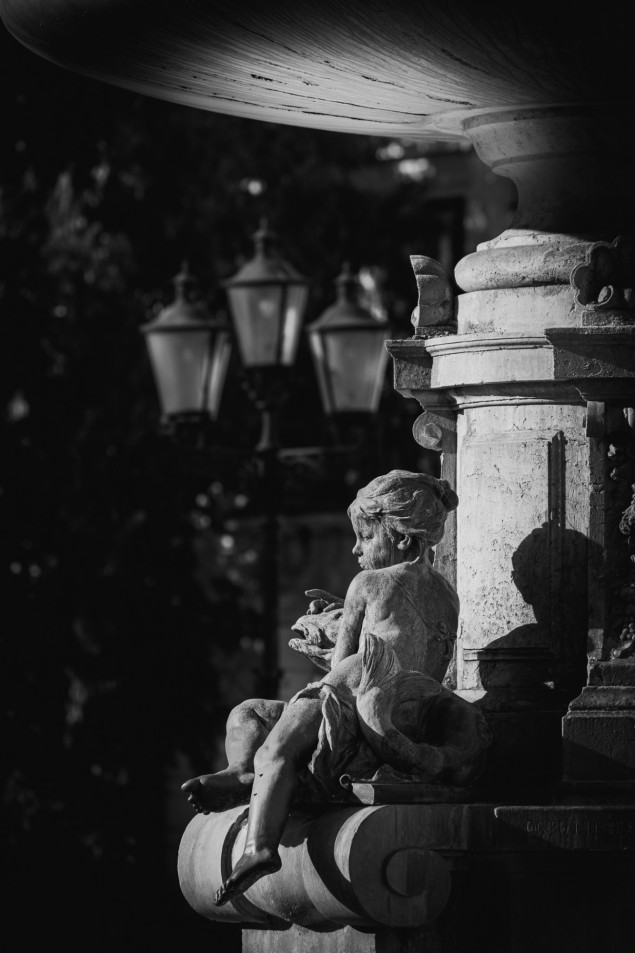 Posledné lúče zapadajúceho Slnka vytvárajú dramatickú svetelnú atmosféru a modelujú sochu na fontáne.