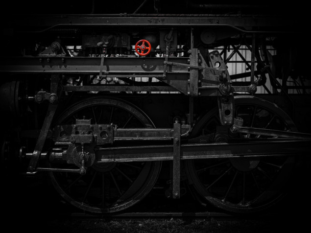 Červené koleso na tmavom pozadí parnej lokomotívy.