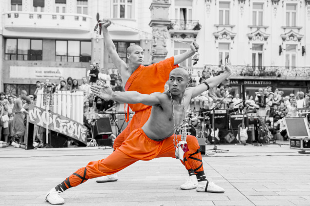 Výrazné oranžové róby šaolinských bojovníkov prirodzene vynikali na šedivom pozadí.