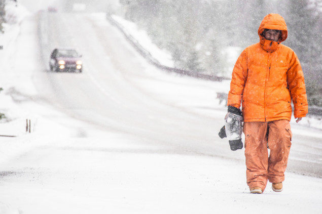 Oranžová bunda prirodzene vynikla na šedivom zimnom pozadí.