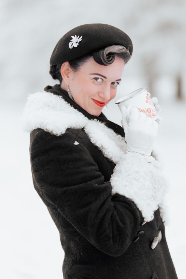 Portrét v zimnom lese. Vďaka monochromatickému oblečeniu vynikne červené líčenie.