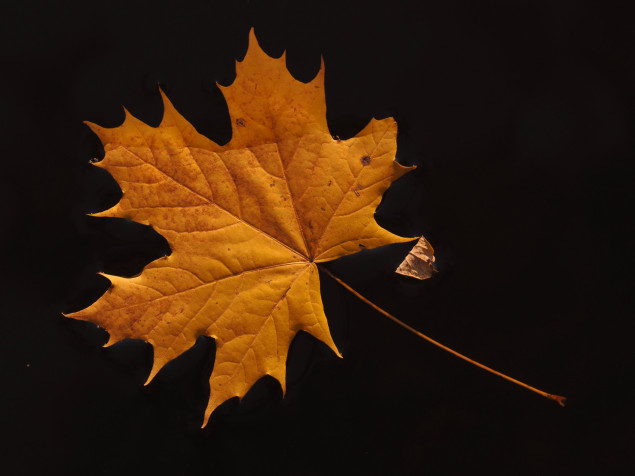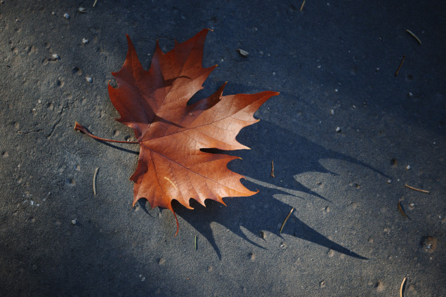 Jesenný list oranžovo svieti na tmavom asfalte.