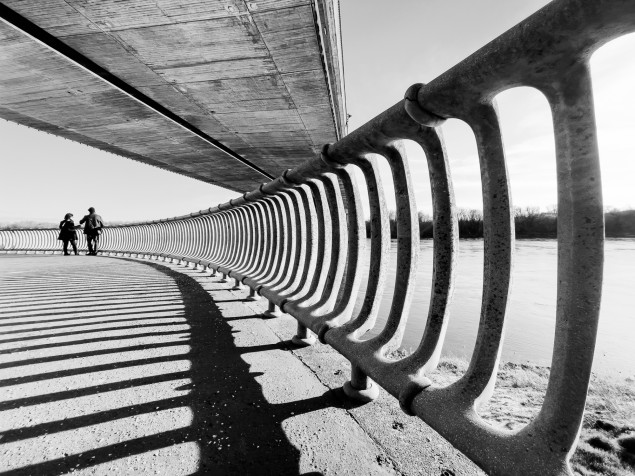 Zvlnené línie cyklomostu slobody si priam žiadajú využiť v kombinácii so symetrickou kompozíciou.