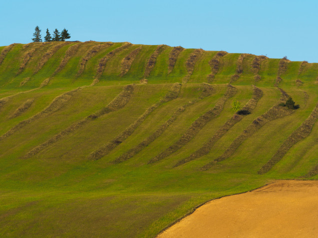 Diagonálne orientovaná línia poľnej cesty vás prevedie celou plochou záberu až k staveniu na kopci.