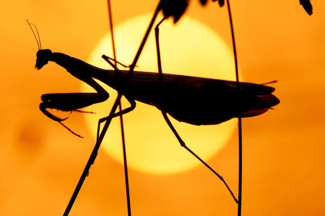 Vysoký kontrast medzi siluetou modlivky a oblohou so Slnkom v pozadí. Silueta dáva vyniknúť tvarom.