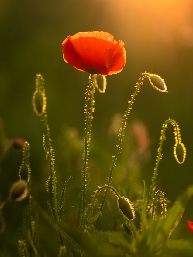 Chĺpky makov tvoria orámovanie a dajú ešte viac vyniknúť tvarom, rastliny výraznejšie oddelia od pozadia. Efekt obrysového svetla dopĺňa rozostrenie pozadia.
